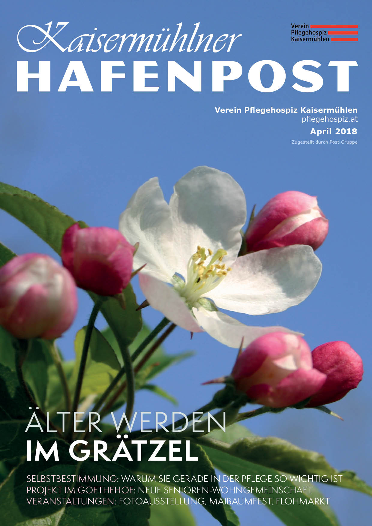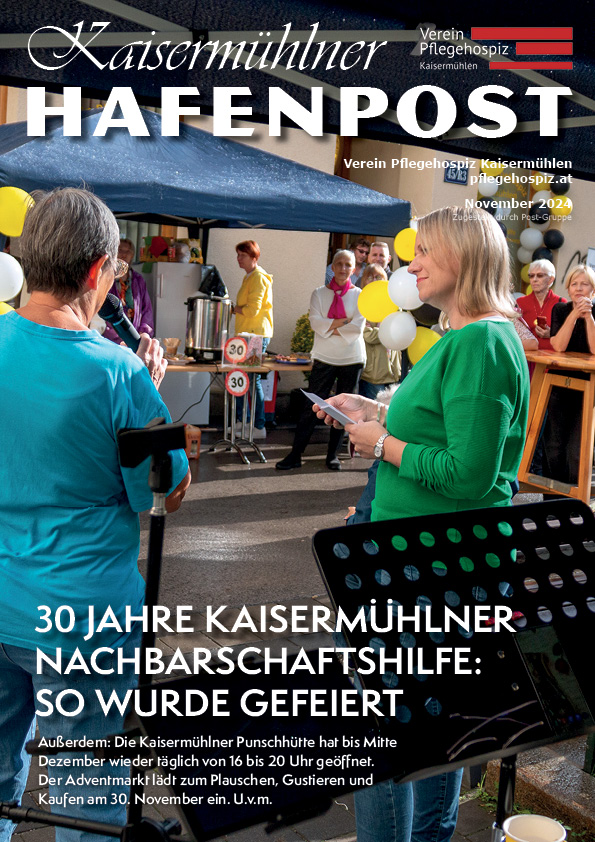 Die Kaisermühlner Hafenpost, das Magazin des Verein Pflegehospiz Kaisermühlen, erscheint zwei- bis dreimal jährlich. Sollten Sie die aktuelle Ausgabe nicht per Post erhalten haben, können Sie sie gerne im Büro der Kaisermühlner Nachbarschaftshilfe abholen. Weitere Ausgaben können Sie hier auch als PDF lesen oder herunterladen, dazu einfach die jeweilige Titelseite anklicken.